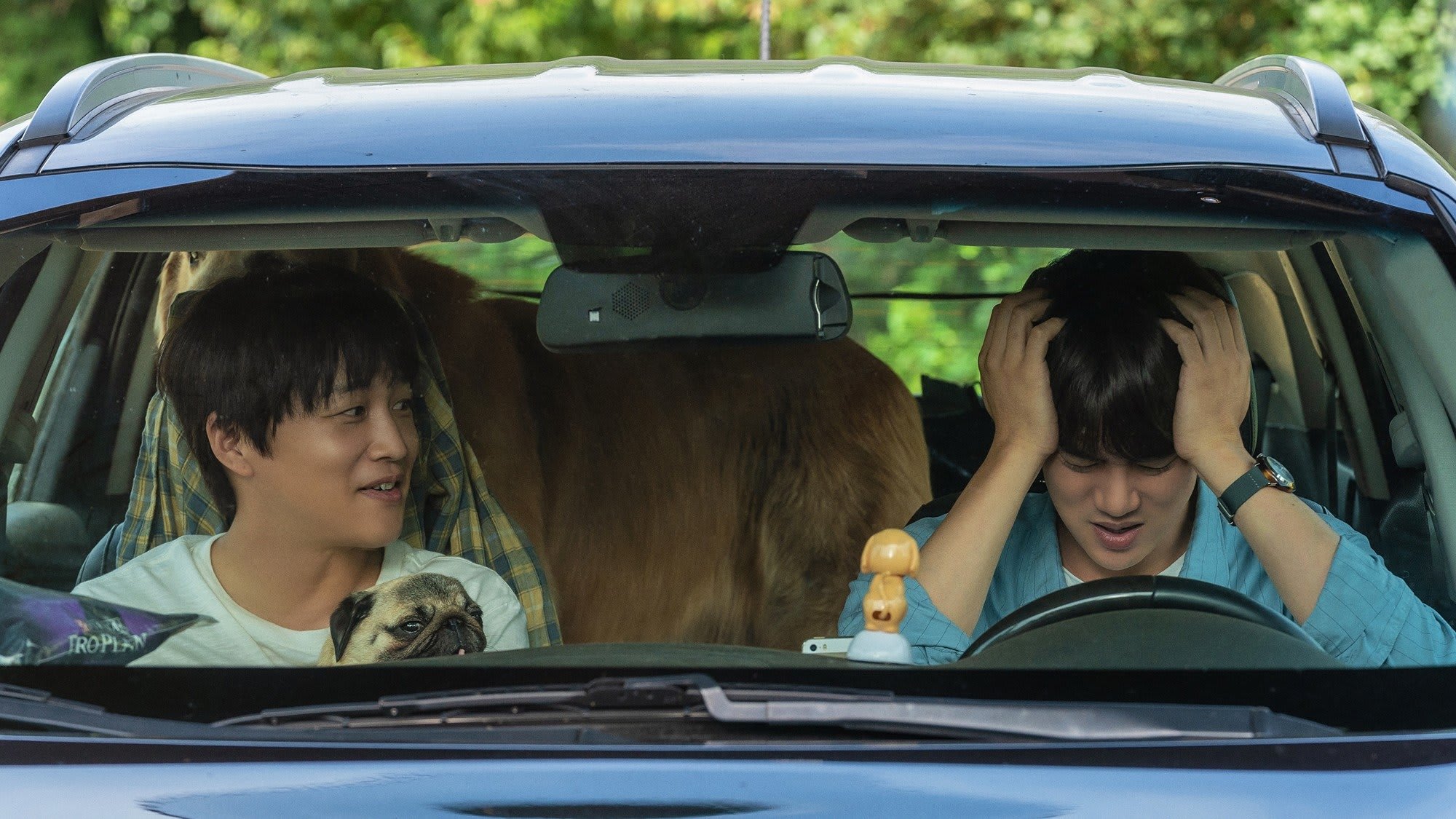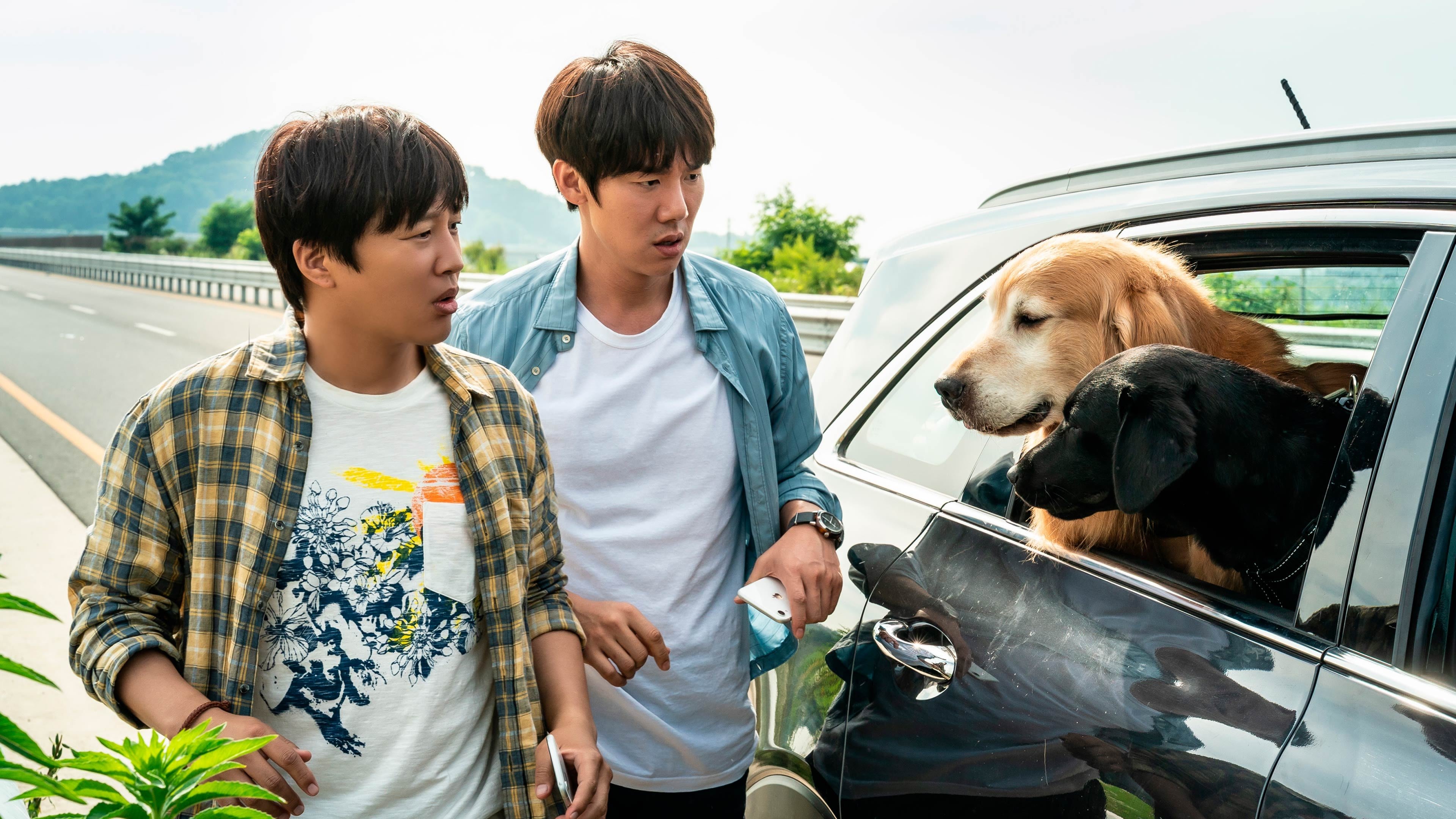 Their rescue streak keeps snowballing. At a rural Airbnb, the innkeeper boasts about fattening his small dog for sale to a restaurant, and Min‑soo—shaken—buys the animal on the spot to save it. Jin‑guk, driven by the same tender impulse, fails to persuade the shelter to take more dogs and instead returns with yet another. If this sounds exaggerated, the film’s point is that it isn’t: impulse purchases, backyard chaining, and abandonment make fertile ground for overrun shelters and impossible choices. The tone never scolds; instead it lets absurdity and affection reveal how quickly “someone should help” becomes “I guess that someone is us.” On their way to Jeju, the cousins have transformed from delivery men into accidental rescuers. The road is funny, yes, but it’s also teaching them what responsibility actually costs.