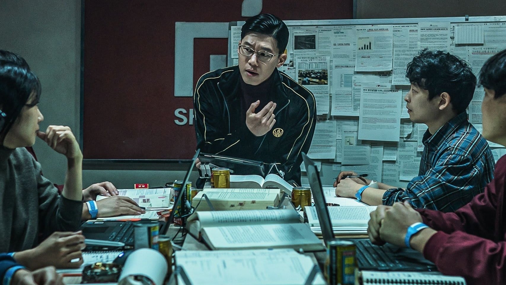 The Glass‑Office Interview: Pro Kwak’s first conversation with Seo‑joon plays like a chess opening. He praises empathy as a tool, not a virtue, and studies the pupil who might replace him someday. The office overlooks dozens of callers in their headsets, a visual sermon on power and distance. Seo‑joon pretends to admire the “system,” while quietly mapping cameras, exits, and server cables snaking under desks. It’s one of the film’s most chillingly calm scenes.
