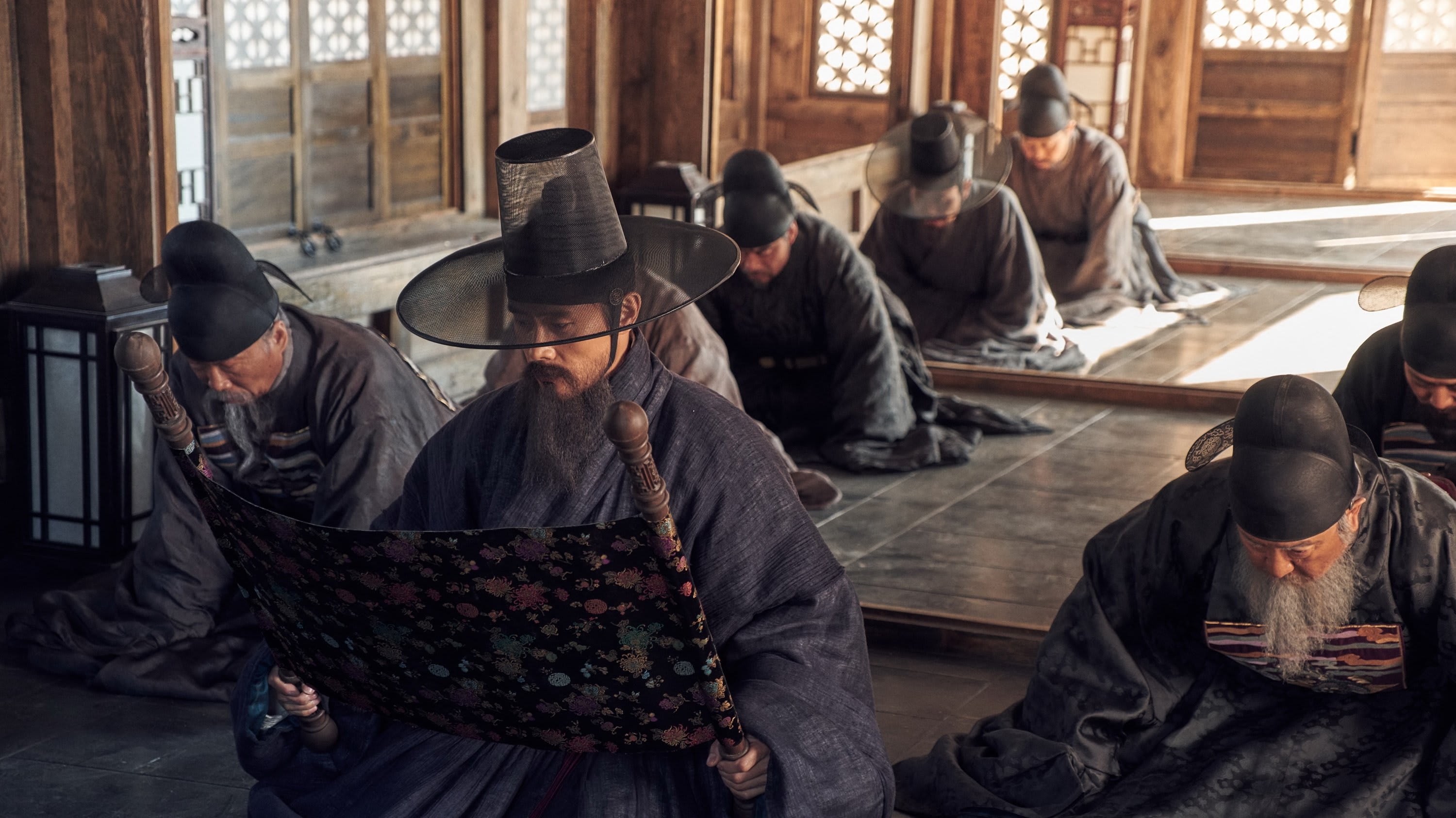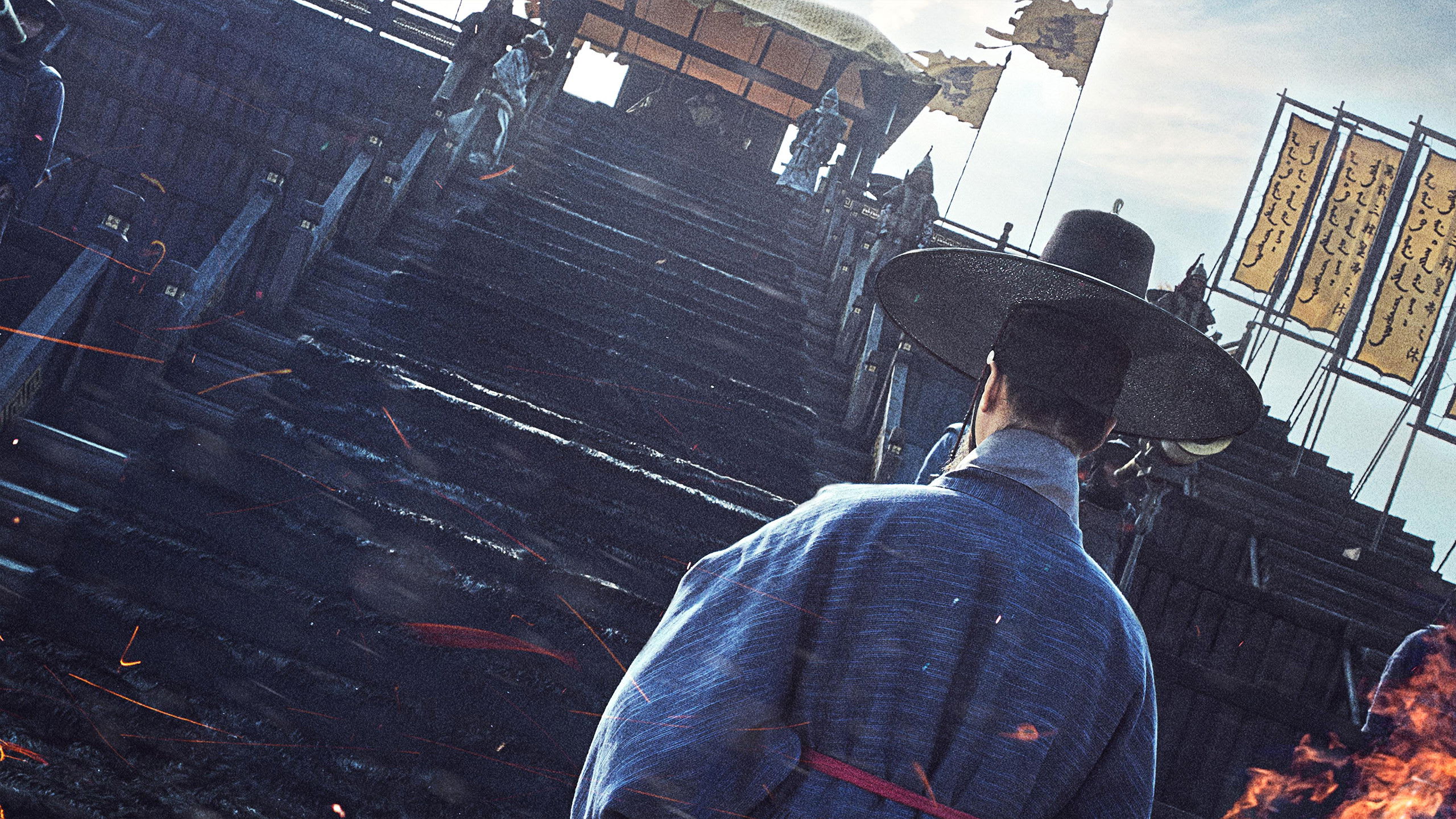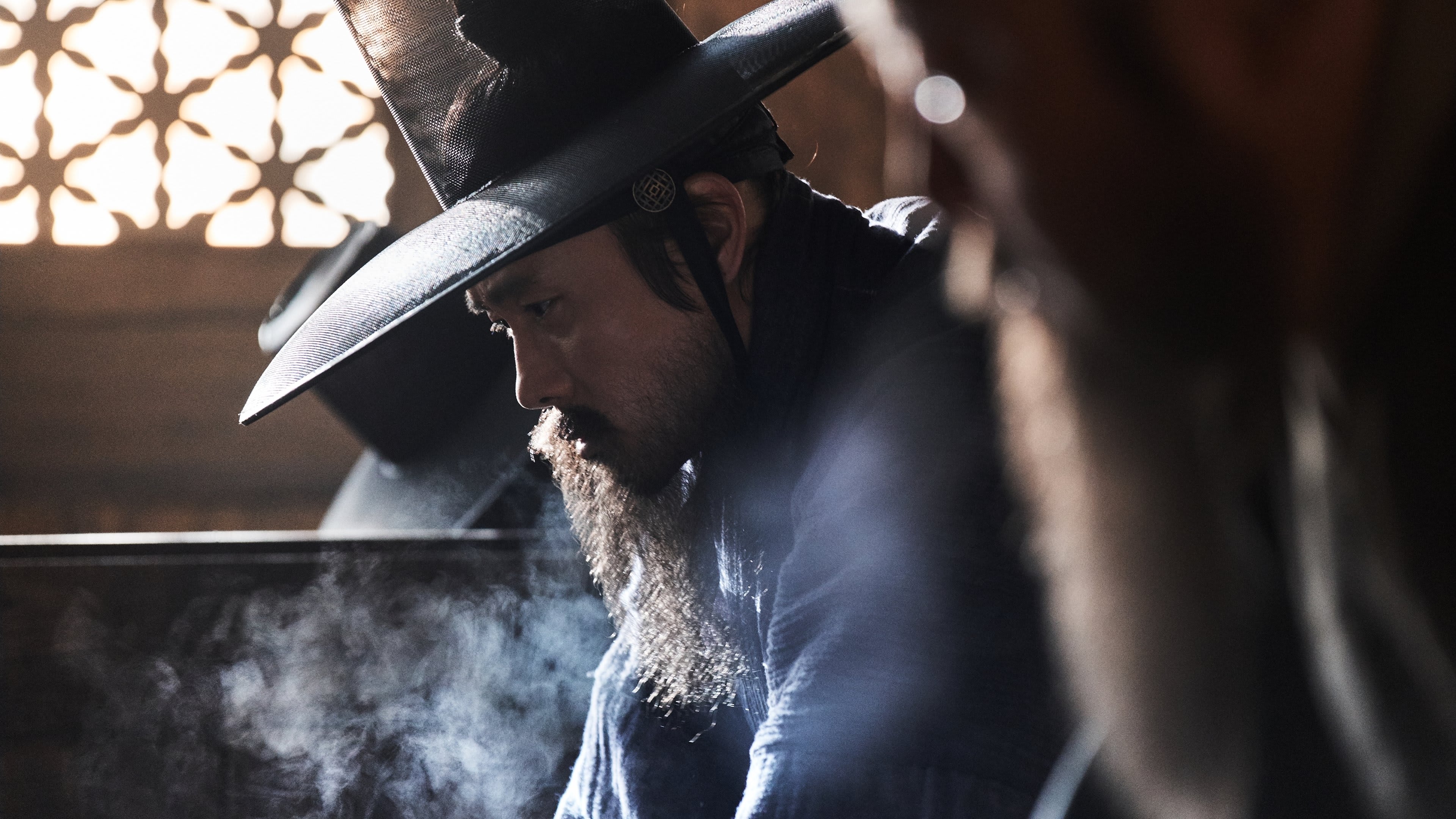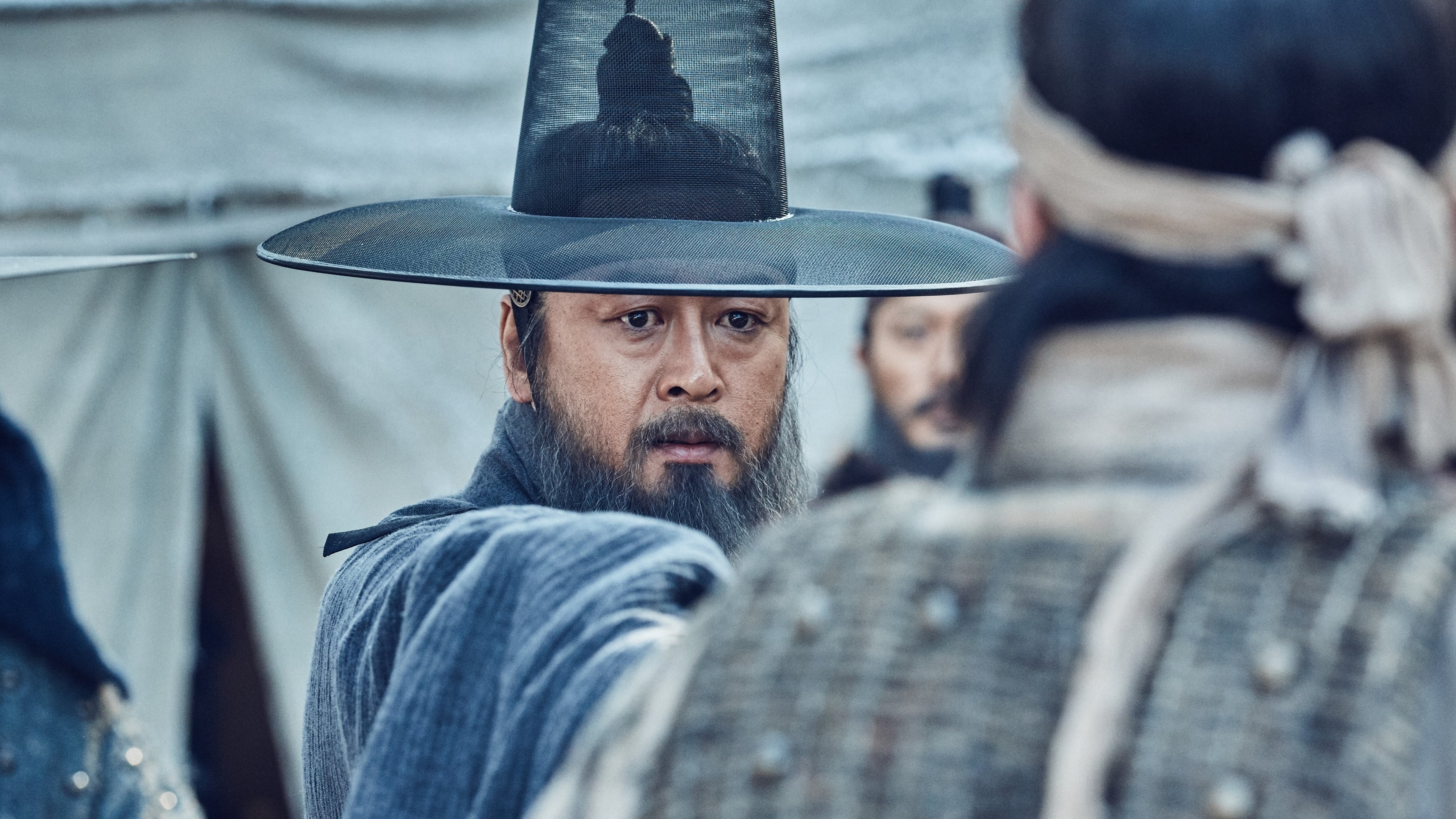 Life inside the fortress is rendered with tactile intimacy: smoke-blackened kitchens, cracked hands ladling thin porridge, and sentries stamping their feet for heat that never comes. Commander Lee Shi-baek keeps discipline on the ramparts, where men hold positions not just against arrows but against sleep and despair. In the alleys, a young recorder jots down rumors because even information has become a kind of ration. The palace rooms are no warmer; courtiers pull their robes close as if cloth could muffle a conscience. The cinematography frames bodies as weary architecture—people turning into the very walls they defend. Through it all, Ryuichi Sakamoto’s score threads a mournful pulse, like breath fogging in the dark.